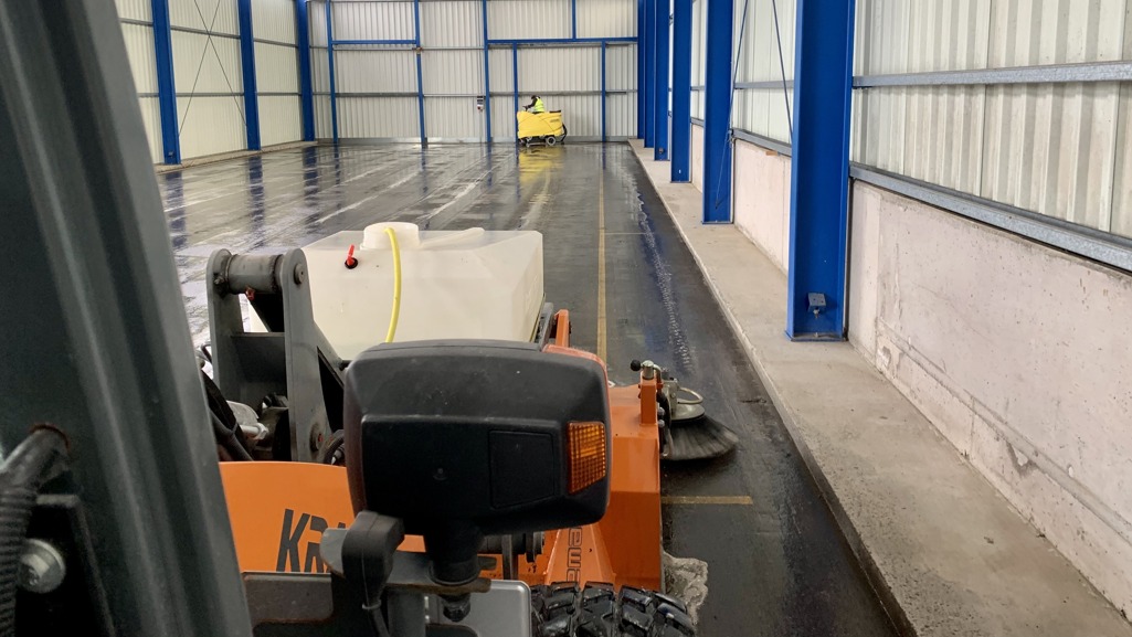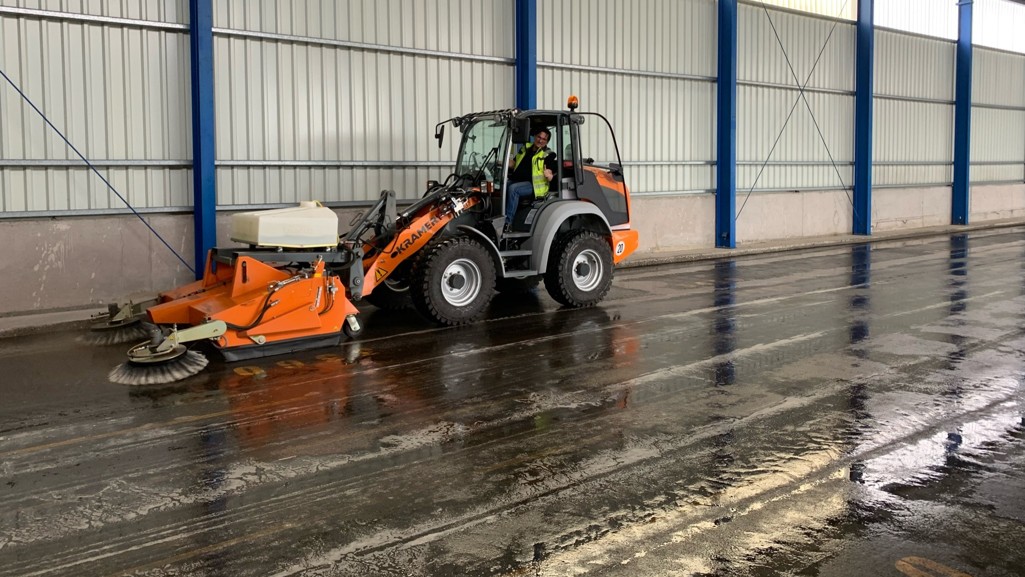 ... eine Kärcher Kehrscheuer Saugmaschine sowie eine Bema Kehrmaschine am Kramer Radlader.