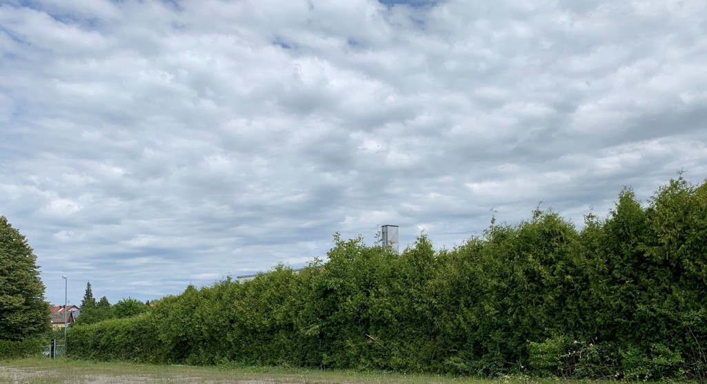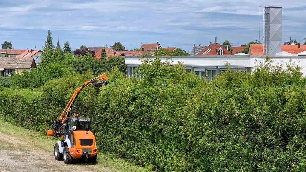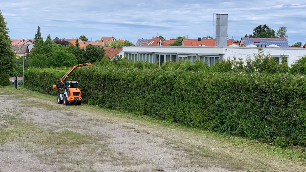 Schon seit langem wurde die Hecke nicht mehr geschnitten. Warum? Auch weil sie 50m lang und über 5m hoch ist. Ein Fall für unseren Radlader mit Heckenmulcher.